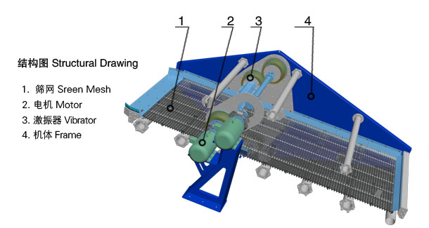 主要由篩箱、篩框、篩網(wǎng)、振動(dòng)電機(jī)、電機(jī)臺(tái)座、減振彈簧、支架等組成。